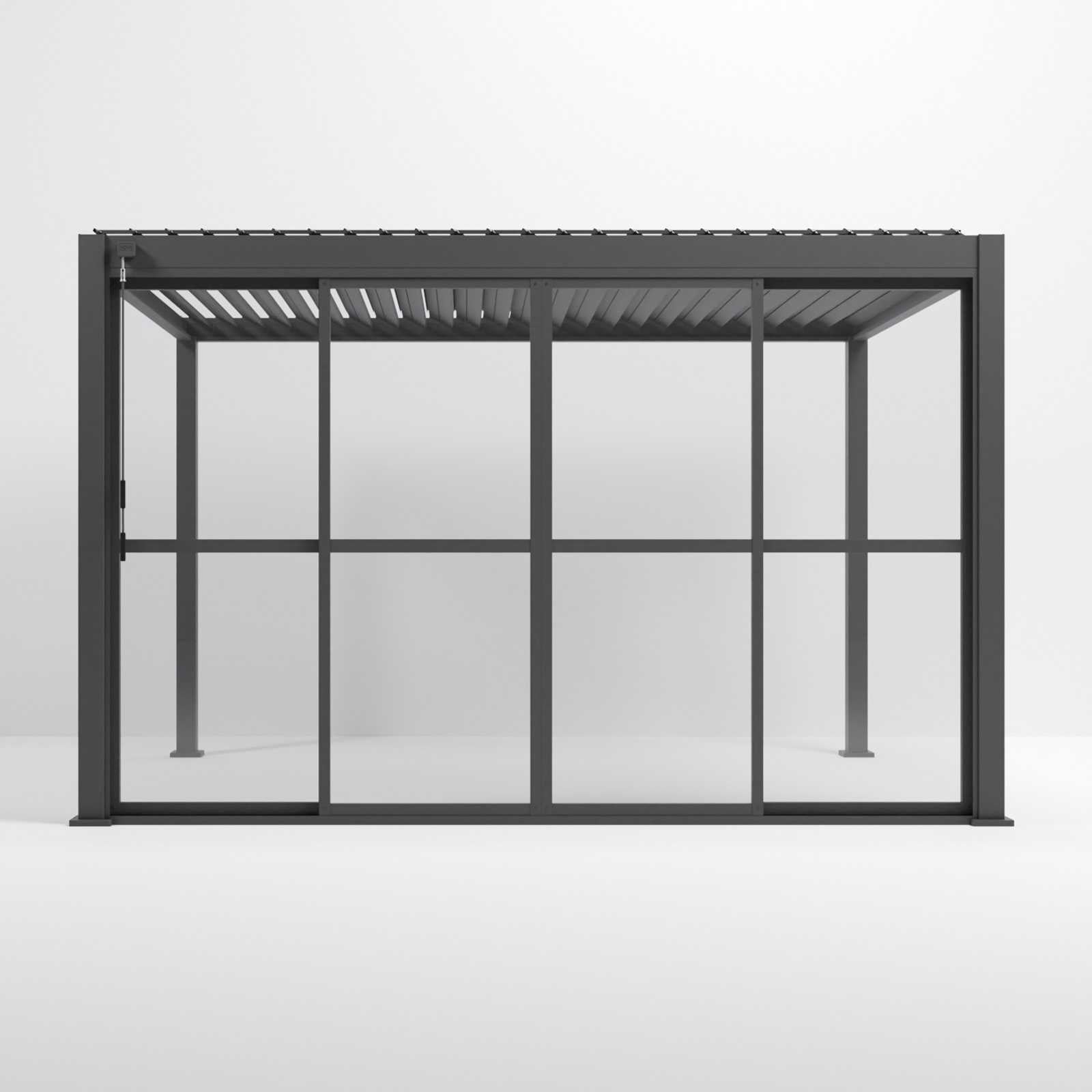 The Nova Titan Clear Sliding Doors are a purpose-built enclosure system designed to fit the Nova Titan pergola frame. Floor-to-ceiling clear panels set within a powder-coated grey aluminium frame slide smoothly on a bottom-mounted track, sealing out wind, rain, and cold at the touch of a handle — while keeping your outlook completely unobstructed.