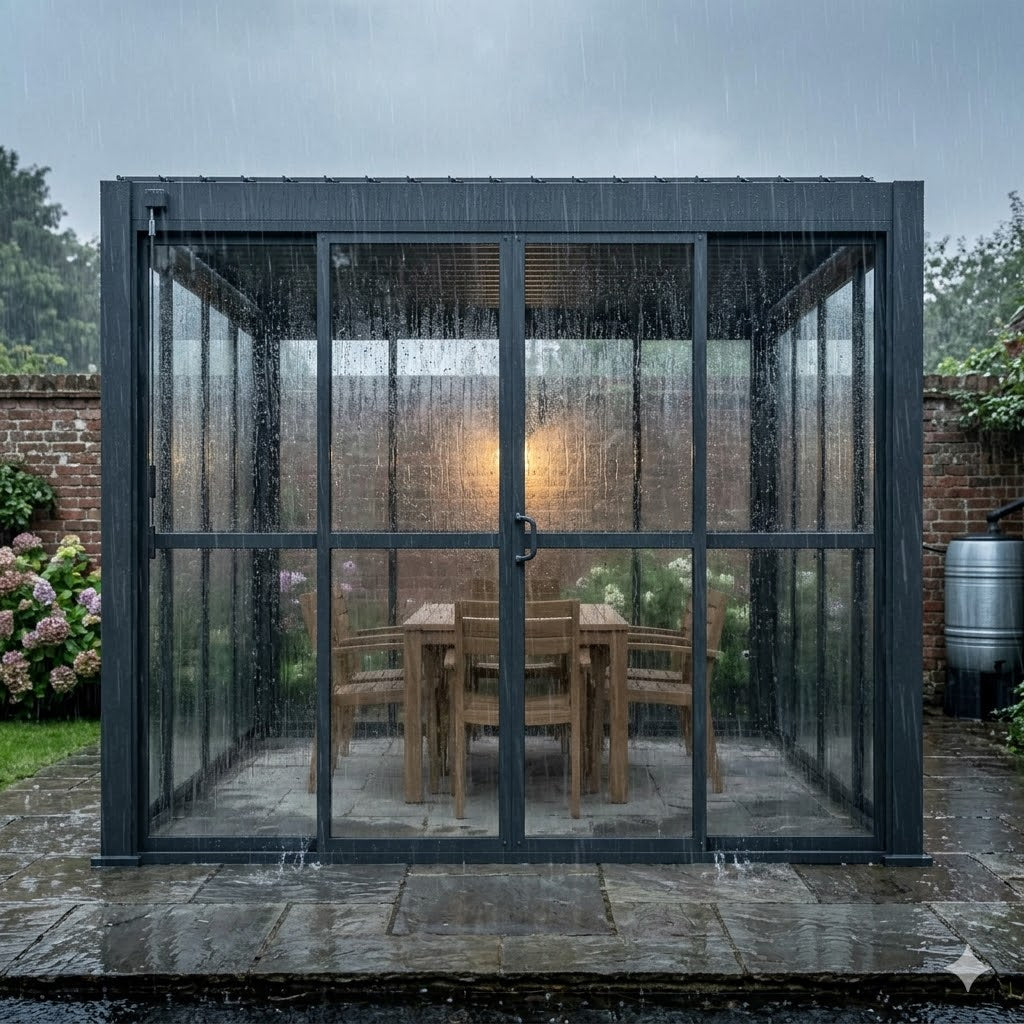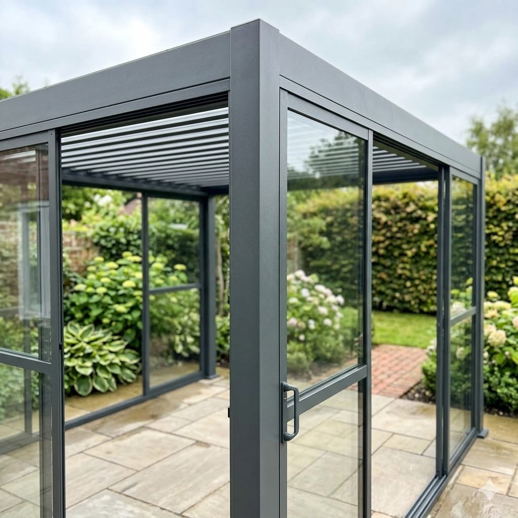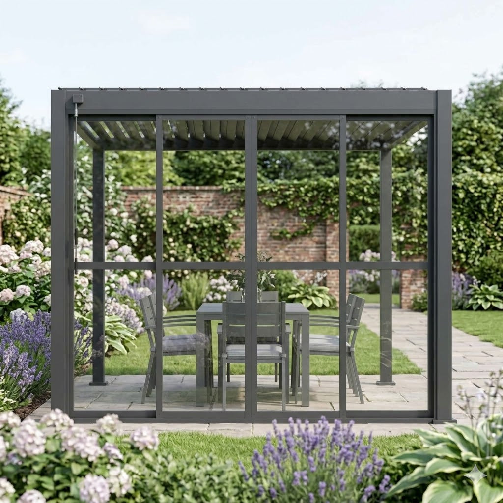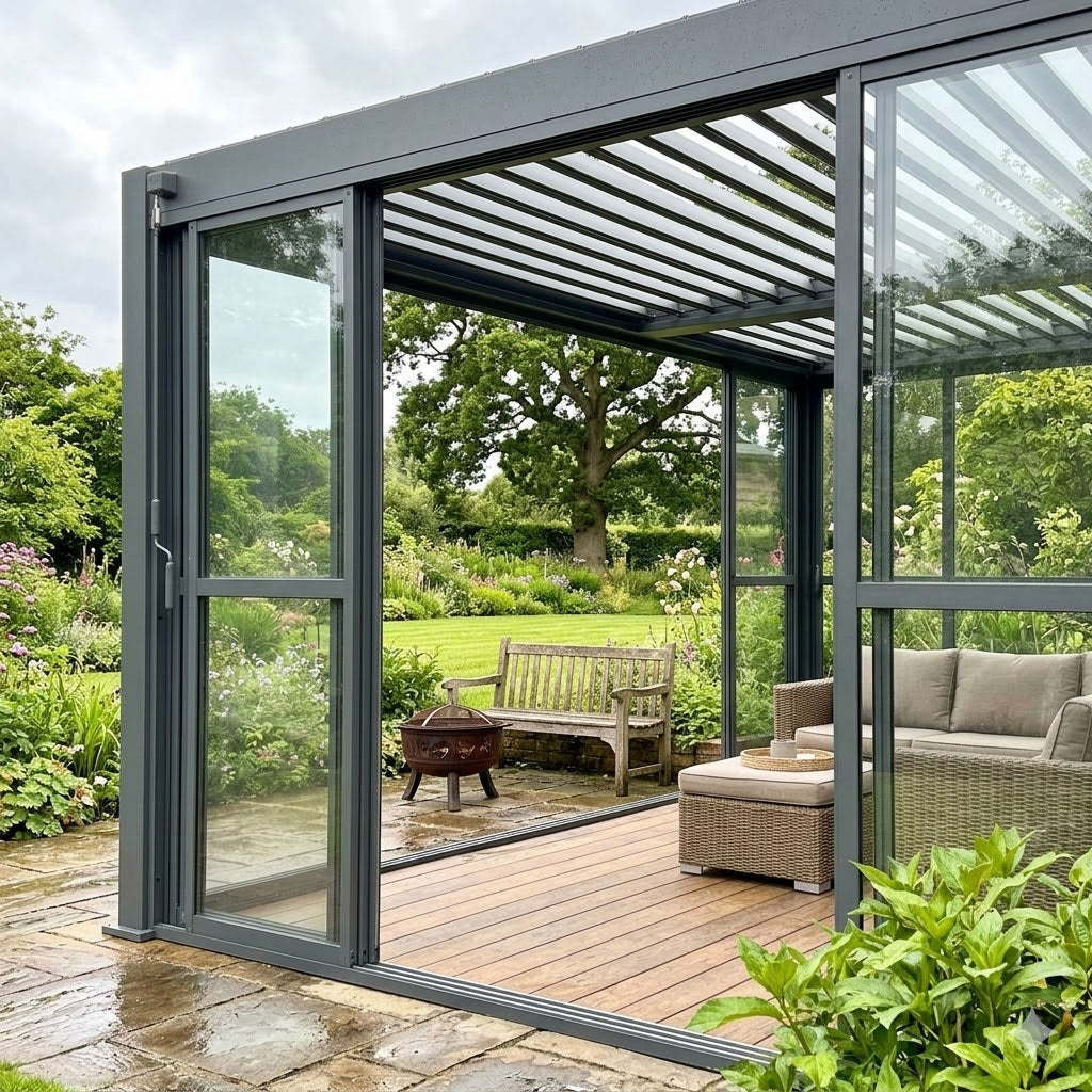 The clear sliding doors transform a covered patio into a genuinely usable, weatherproof space — suitable for dining, entertaining, garden offices, or simply enjoying the garden without the chill. Paired with the Titan's adjustable louvred roof, you have total environmental control in every direction.